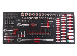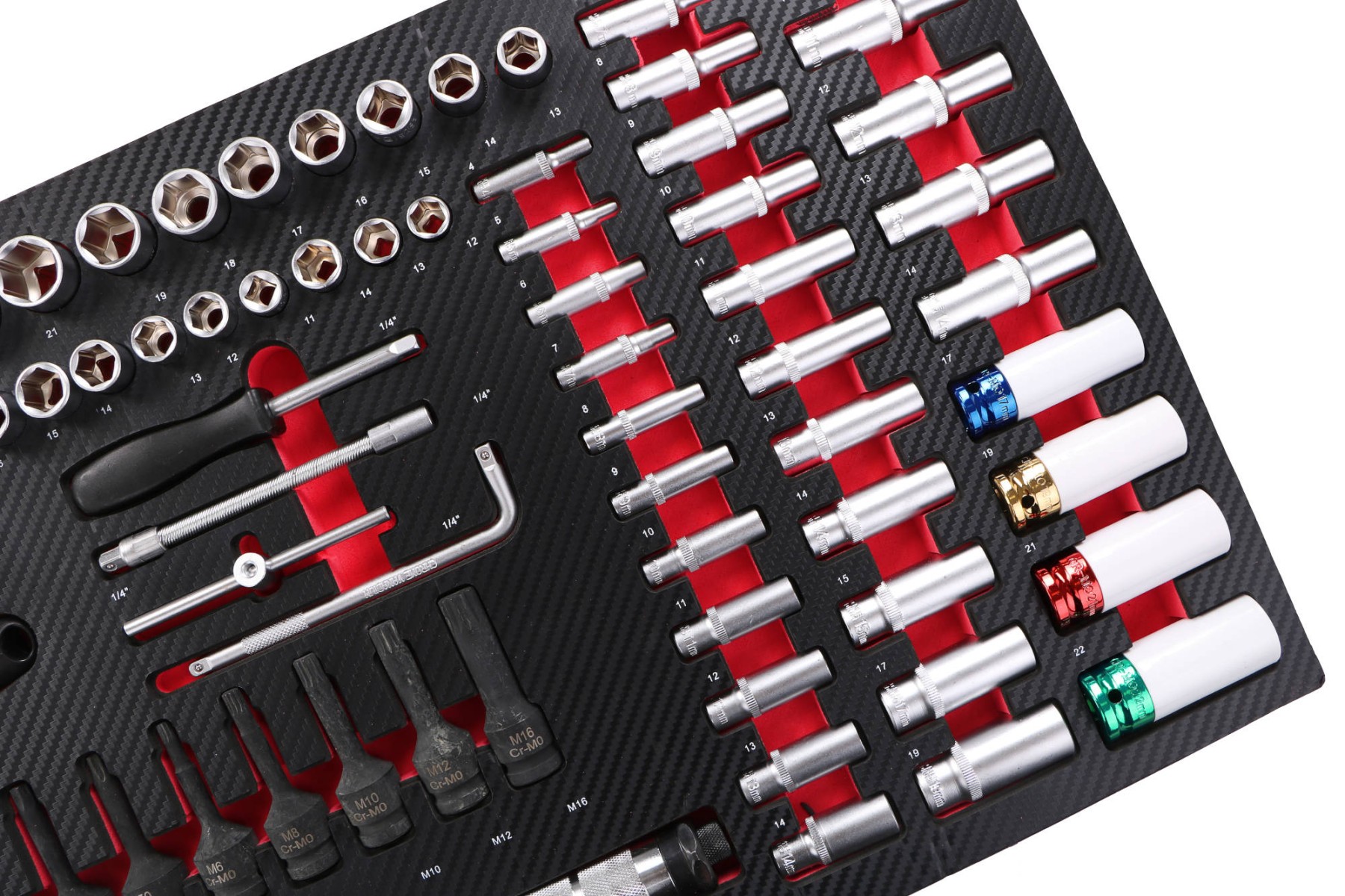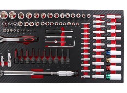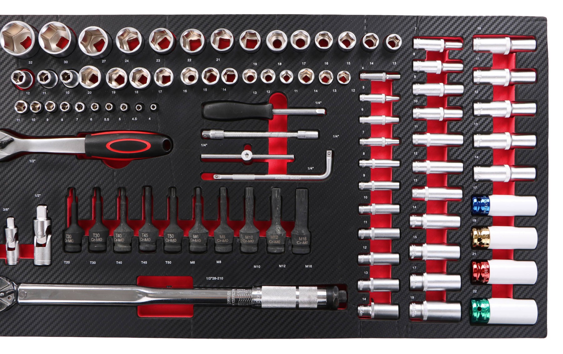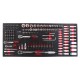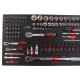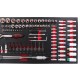 Contenu du chariot :- 1. Tiroir – 136x Douilles, embouts, cliquets, rallonges et clé dynamométrique