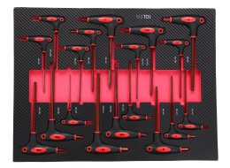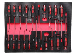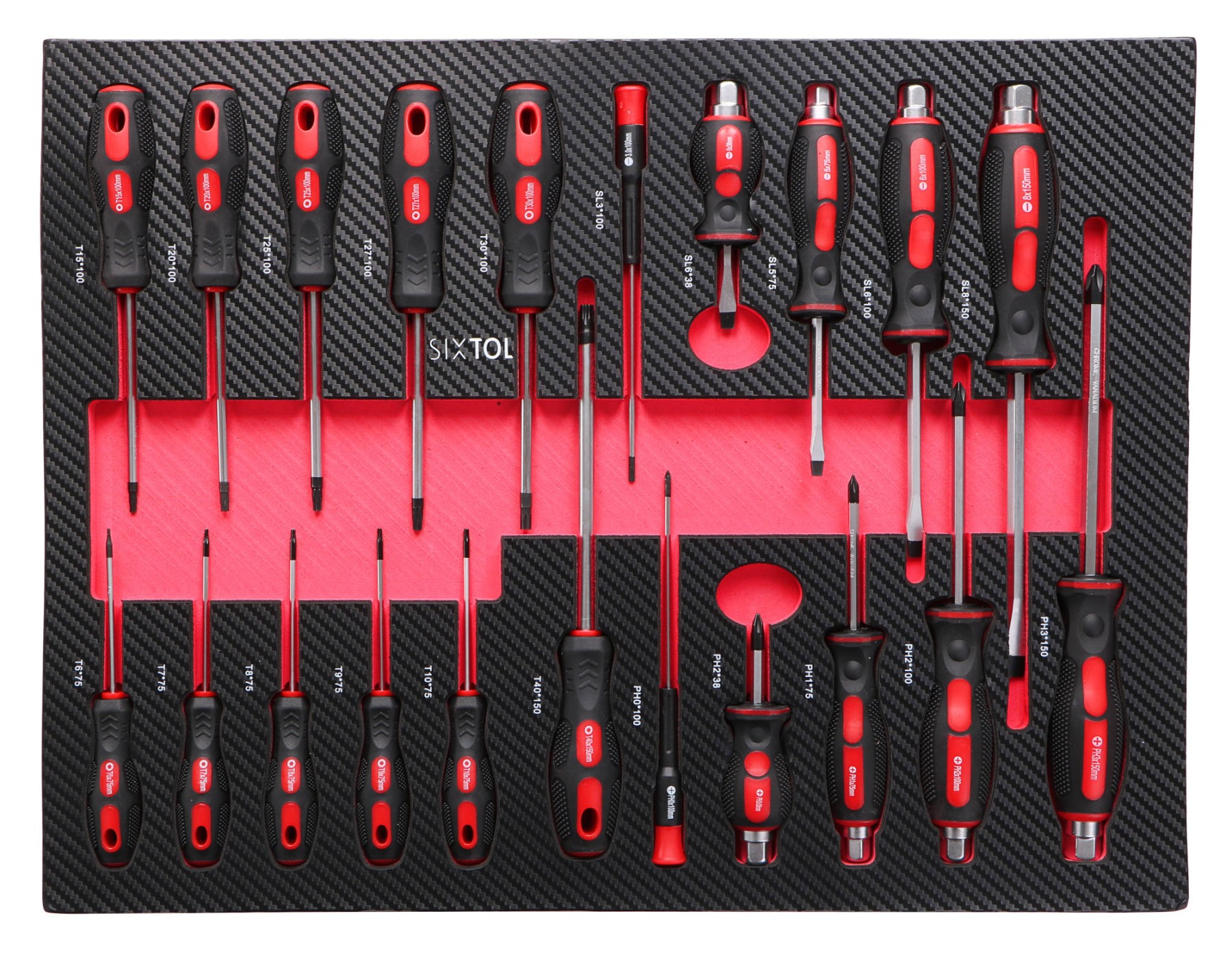 - Clés en T HEX (imbus) : H2 × 100 mm; H2.5 × 100 mm; H3 × 100 mm; H4 × 150 mm; H5 × 150 mm; H6 × 150 mm; H7 × 150 mm; H8 × 200 mm; H10 × 200 mm- 7. Tiroir – 21x tournevis (matériau 40Cr)