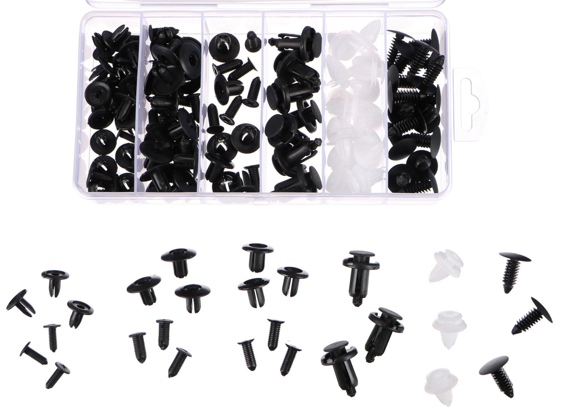 Contenu :- 6 types de clips et de goupilles pour la fixation des pare-chocs, des ailes, des housses, des revêtements (coffre), des sièges et des garnitures, ainsi que des panneaux de porte.