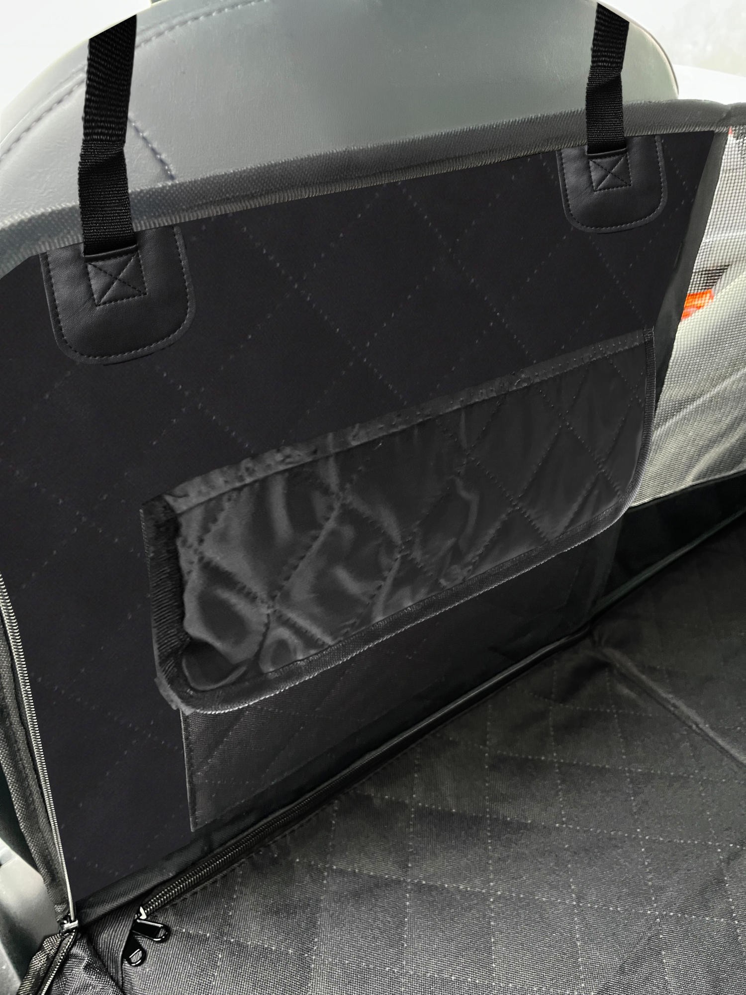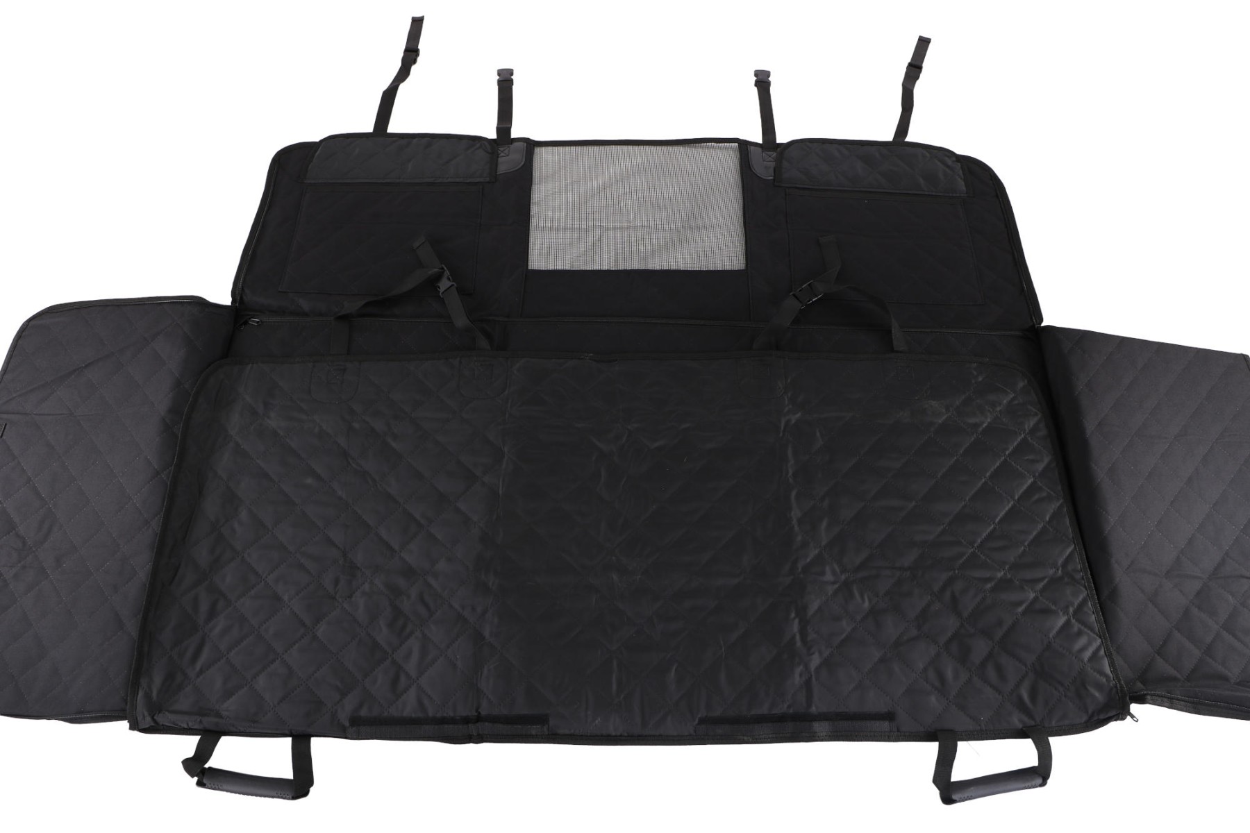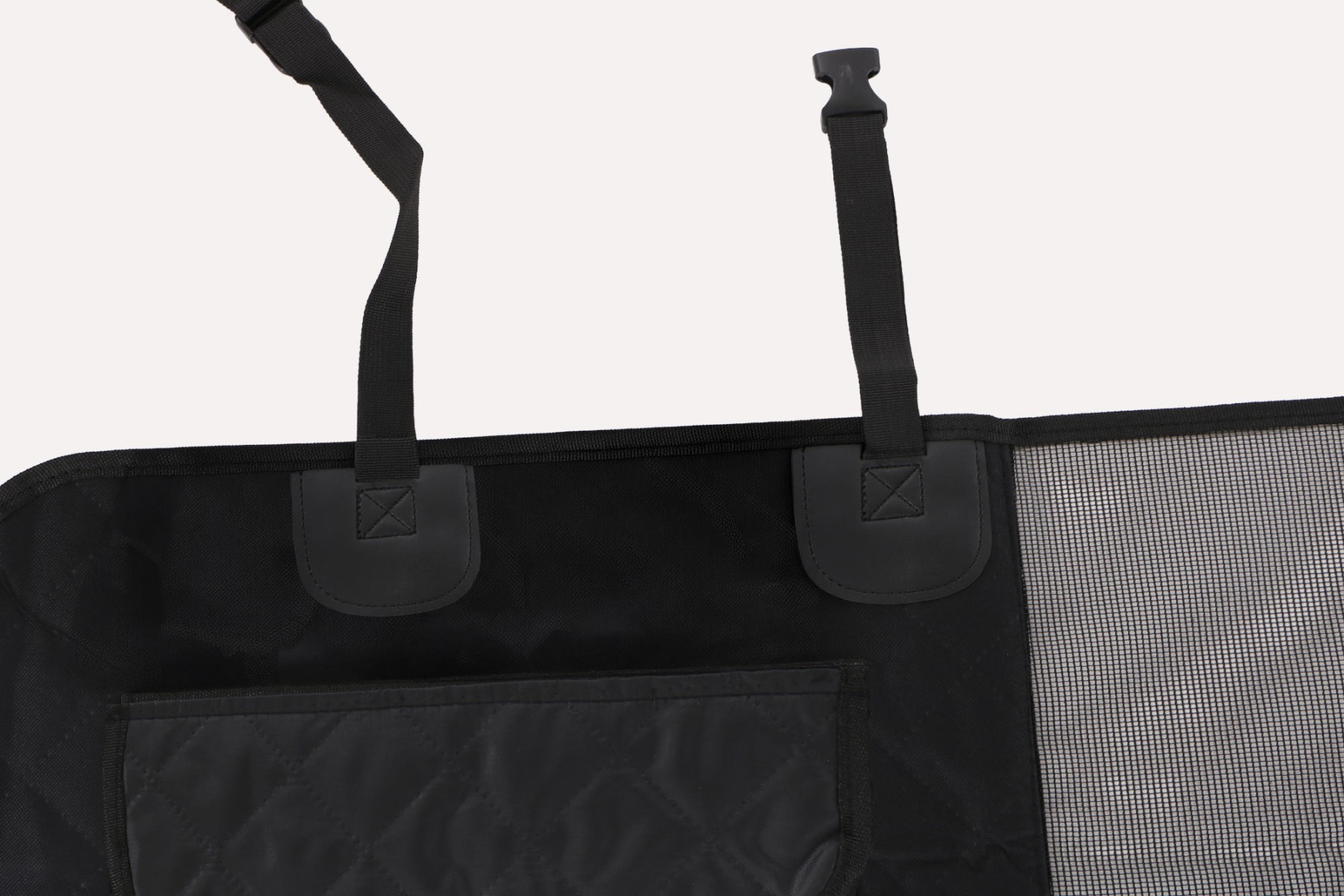 La housse de protection pour voiture SIXTOL CAR BRUNO est conçue pour protéger les sièges arrière lors du transport d'un chien et aide à maintenir l'habitacle propre et intact. La housse est matelassée et fabriquée en tissu imperméable résistant, qui protège la sellerie contre l'eau, la boue, les poils et l'usure mécanique. Grâce à des sangles réglables avec mousquetons, elle se fixe facilement aux appuie-têtes et reste stable pendant le trajet. Les parties latérales de la housse offrent une protection supplémentaire des flancs des sièges lors de la montée et de la descente du chien et peuvent être relevées et fixées de chaque côté par une fermeture éclair pour empêcher l'animal de s'échapper lorsque la portière est ouverte. Une partie en filet est incluse pour améliorer la circulation de l'air et permettre un contact visuel avec le chien pendant le trajet. La housse convient non seulement pour le transport de chiens, mais aussi pour protéger l'intérieur lors du transport d'objets divers.