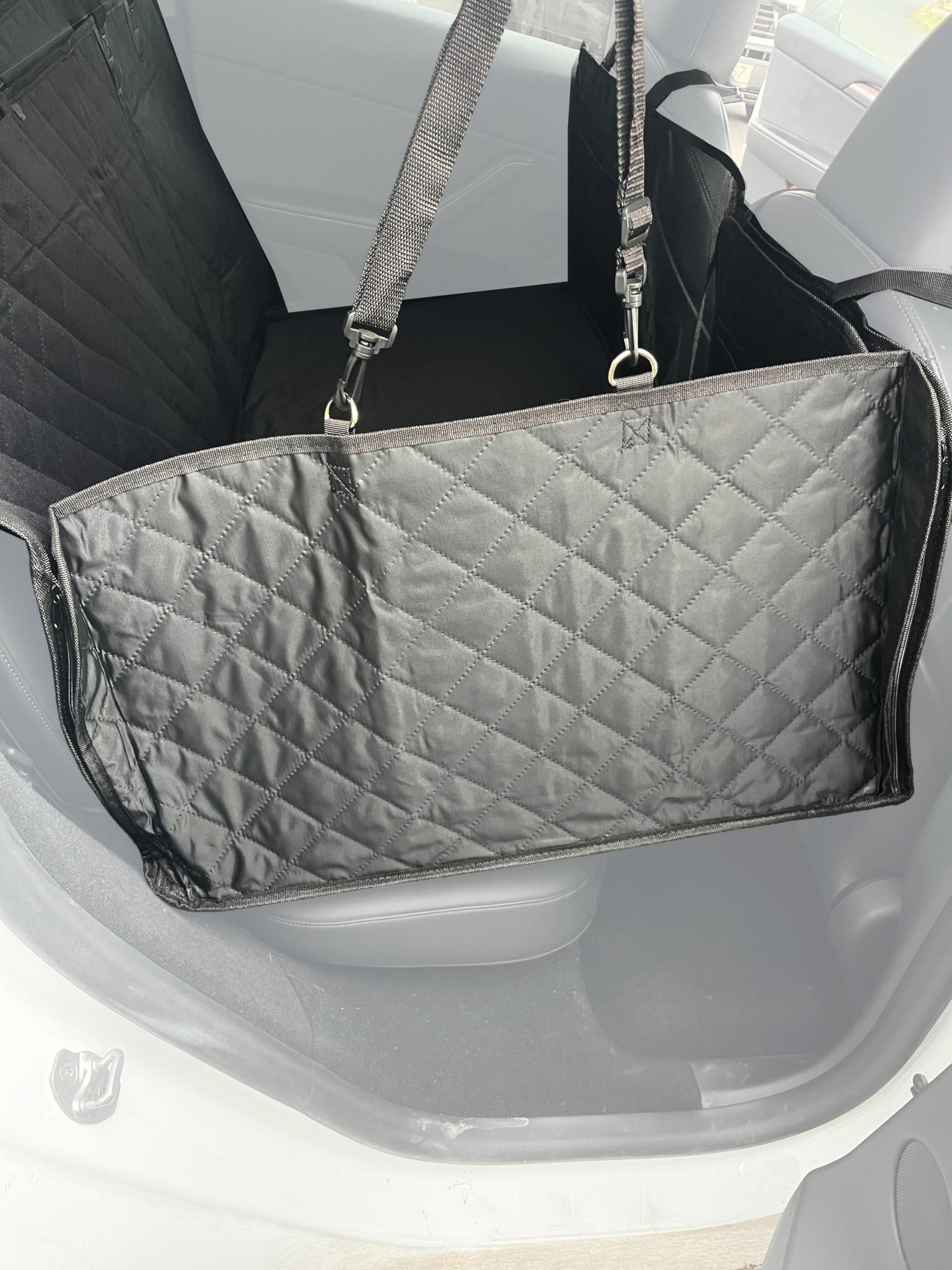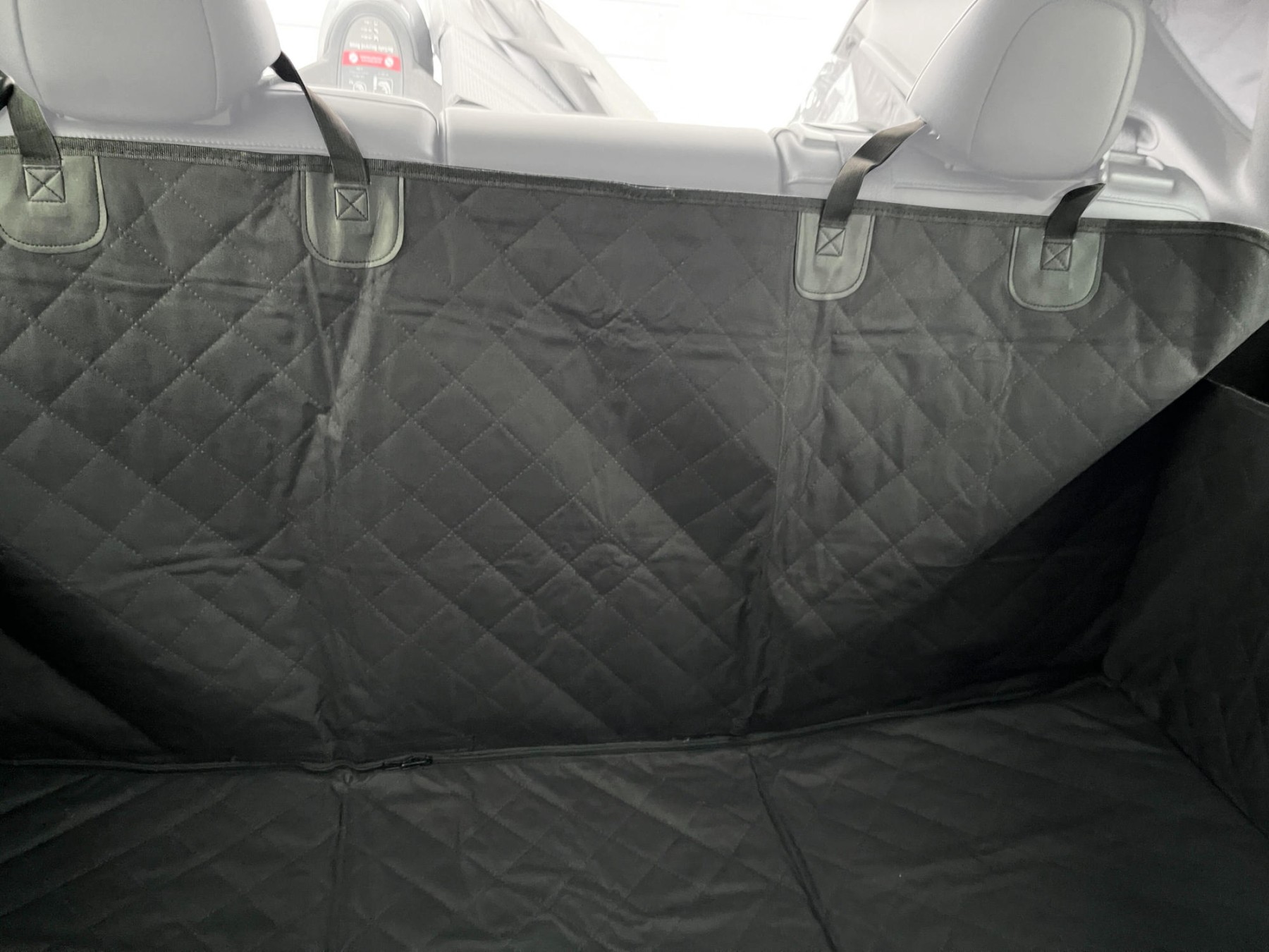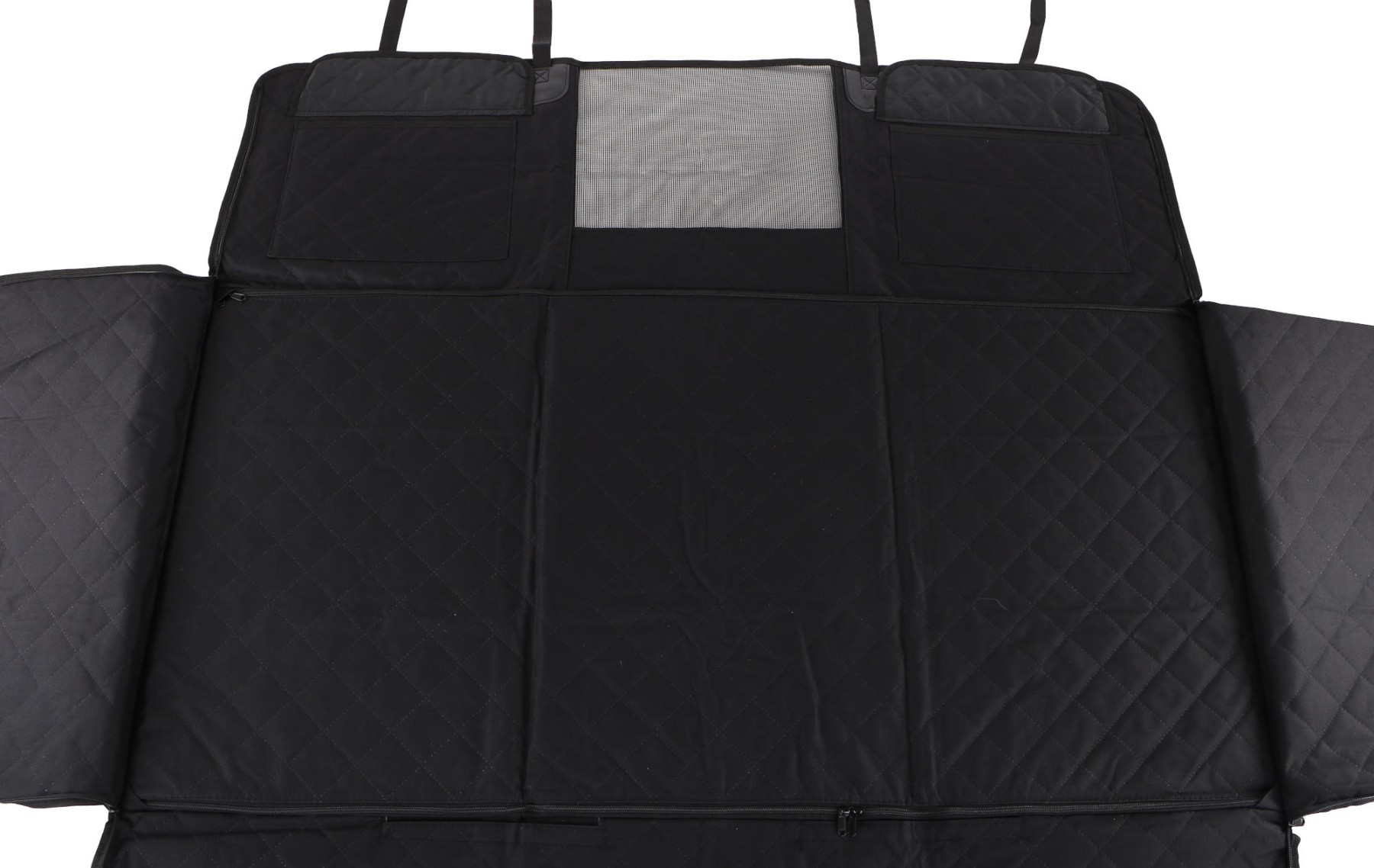 La housse de protection pour voiture SIXTOL CAR BRUNO est conçue pour protéger les sièges arrière lors du transport d'un chien et aide à maintenir l'habitacle propre et intact. La housse est matelassée et fabriquée en tissu imperméable résistant, qui protège la sellerie contre l'eau, la boue, les poils et l'usure mécanique. Grâce à des sangles réglables avec mousquetons, elle se fixe facilement aux appuie-têtes et reste stable pendant le trajet. Les parties latérales de la housse offrent une protection supplémentaire des flancs des sièges lors de la montée et de la descente du chien et peuvent être relevées et fixées de chaque côté par une fermeture éclair pour empêcher l'animal de s'échapper lorsque la portière est ouverte. Une partie en filet est incluse pour améliorer la circulation de l'air et permettre un contact visuel avec le chien pendant le trajet. La housse convient non seulement pour le transport de chiens, mais aussi pour protéger l'intérieur lors du transport d'objets divers.