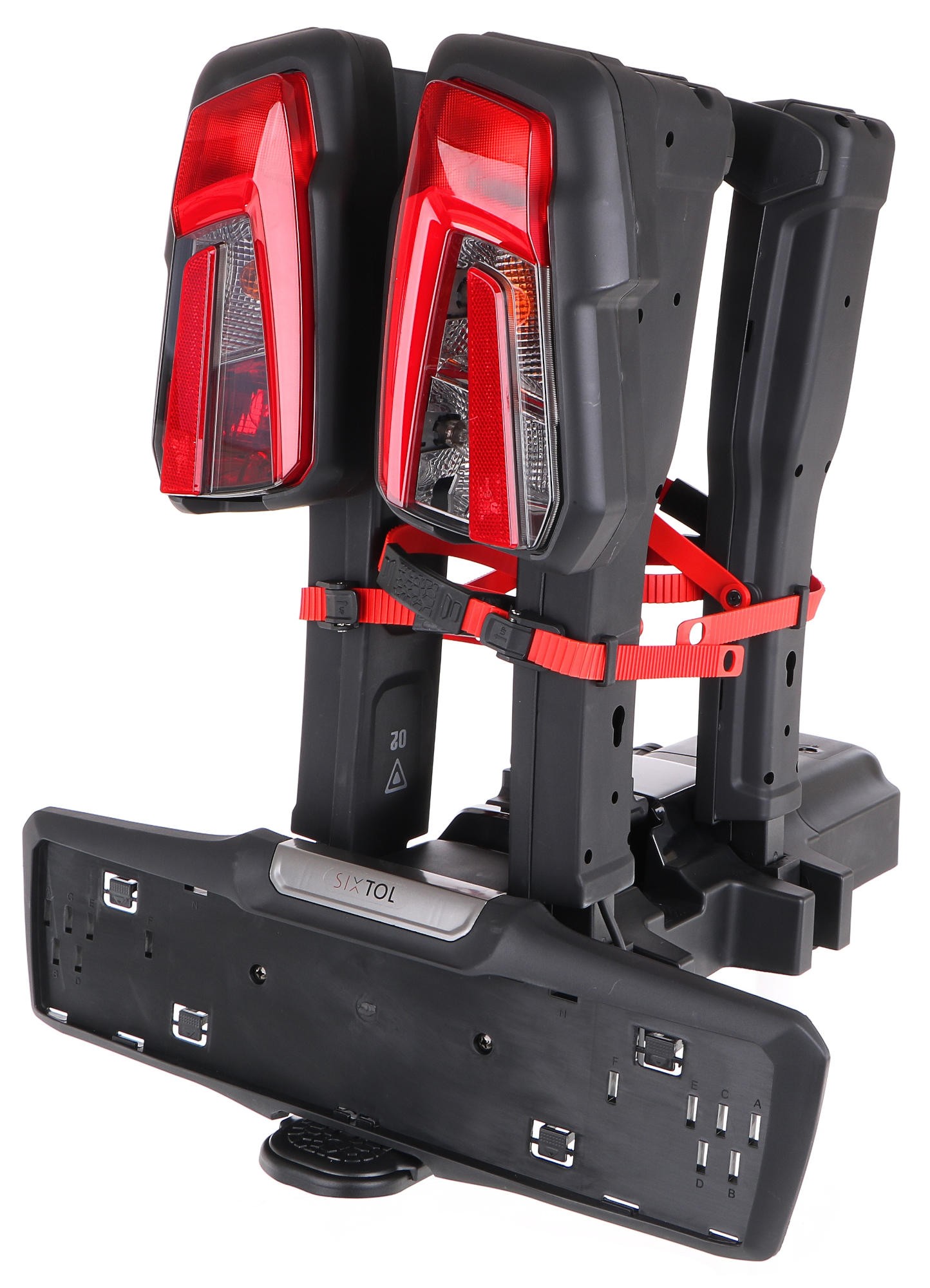 Le porte-vélos pliable SIXTOL E-BIKE 2 PRO est conçu pour le transport sécurisé de deux vélos électriques sur un attelage, avec une capacité totale de 60 kg.