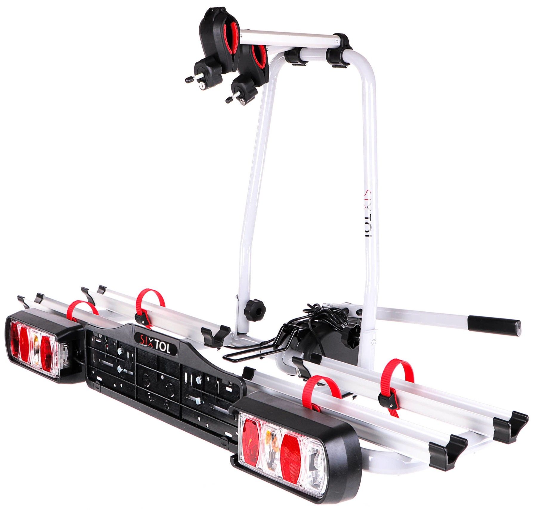 Description complètePorte-vélos d'attelage SIXTOL E-BIKE 2 de haute qualité et robuste pour deux vélos électriques avec fixation sans outil des vélos sur le porte-vélos et protection antivol.